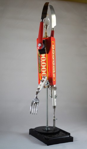 BALLET DANCER -FOUND OBJECT METAL SCULPTURE-VINTAGE CANDY TIN-CZECH CRYSTAL-ANTIQUE WATCH BAND-ASSORTED CUTLERY-BOLTS & SCREWS-NO SOLDER OR WELDS