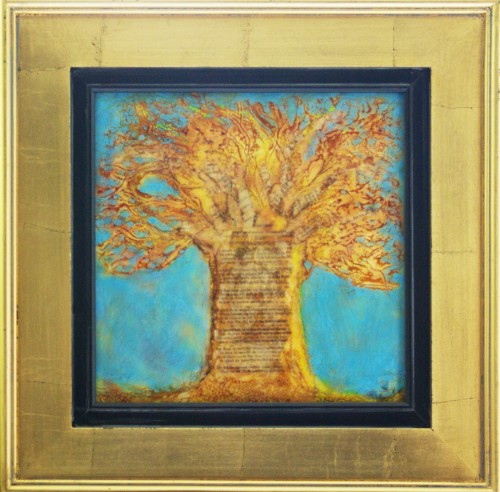 This sturdy tree contains a poem in its trunk, preserving it in beeswax. The colors are from pure pigments and the piece is sealed with shellac. Extremely archival, aging well like the mighty tree