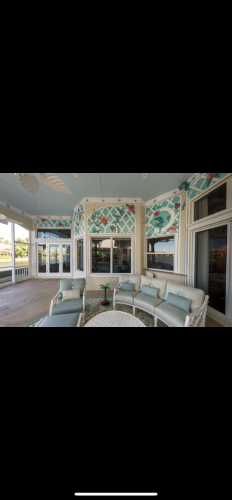 This is a custom patio mural with the inspiration being the client's custom outdoor rug. Lattice work, flora and fauna, parrots and palm adorn the walls of this patio in Jupiter Florida. The faux palm tree columns bring the garden palms indoors. Each mural is custom designed per the client's desires and style.
