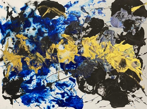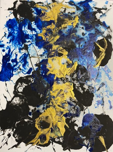 Vibrant blue and gold abstract artwork and broad brush strokes.