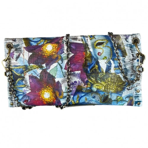 Large leather clutch handbag with monochrome flowers and linear patterns. This handbag is hand cut using a traditional technique and made from premium quality genuine cowhide leather. Every accessory has been hand sketched and hand-painted by us, we use a decoupage technique after the handbag is painted which often takes a few days in the overall process. Every SPIRIDON product is unique and is a truly one-of-a-kind piece of art. When handled with care, your genuine SPIRIDON product ages gracefully with time and becomes a timeless piece of art.