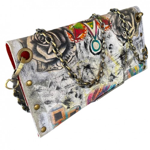 Black roses along with stripes, squares, circles and diamonds, all dipped in colour and harmoniously set on a leather canvas to create an attractive offering for you. A bag that will satisfy your desires.