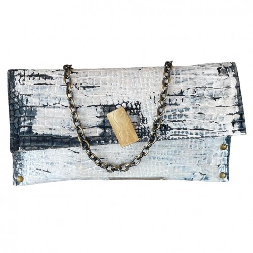 A classic envelope, this stylish bag has a bone clasp and a detachable metal chain. A style that will remain elegant for years to come. Painted on lacquered crinkled white leather It is an amazing reflection of your personal style.