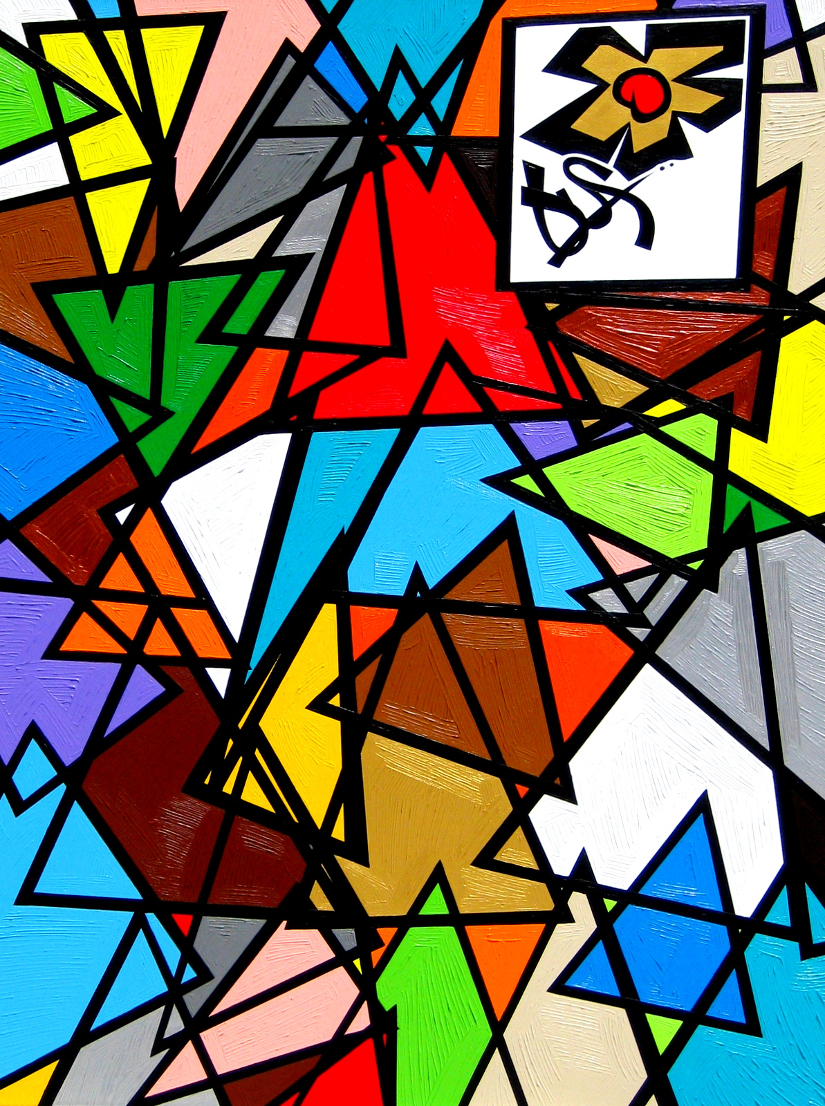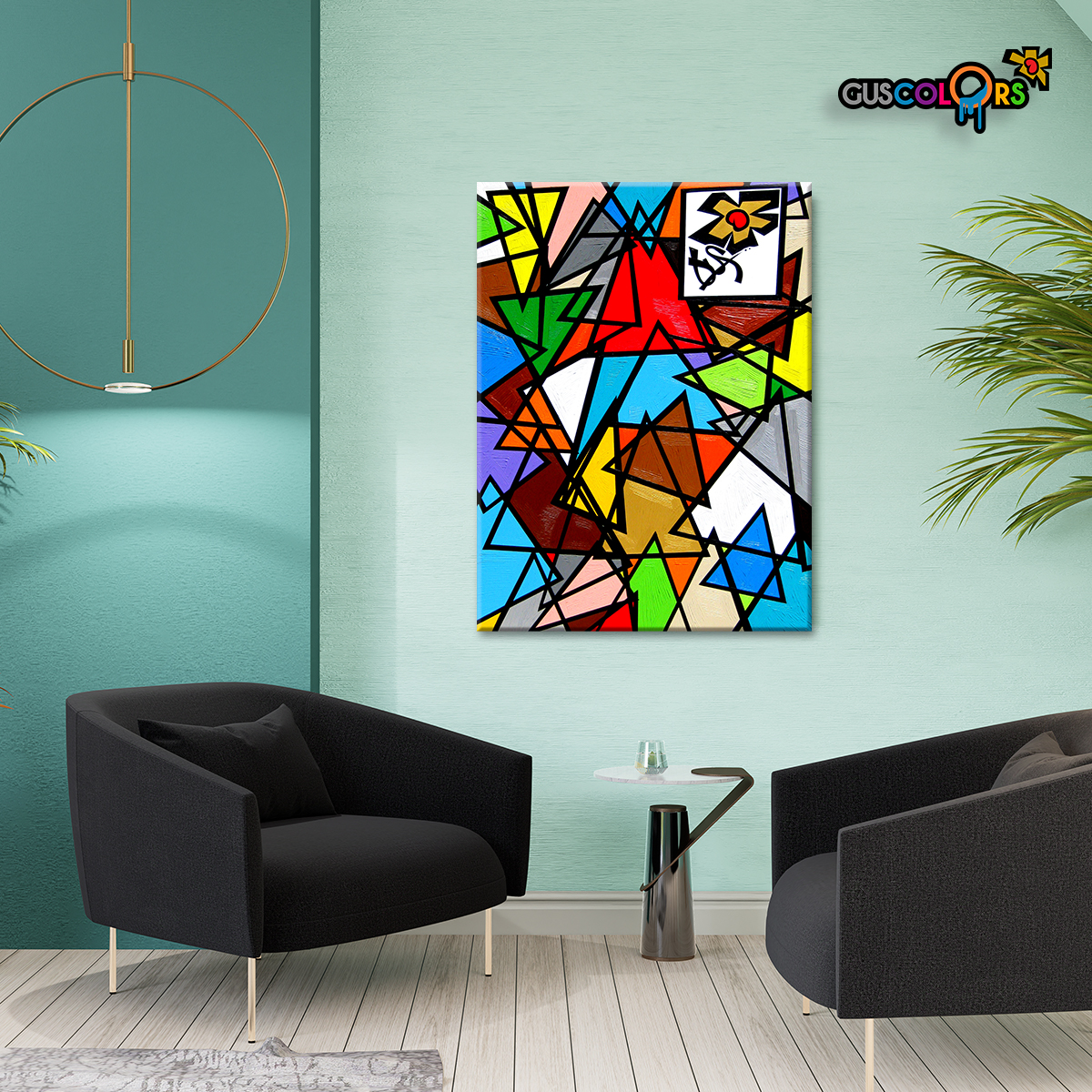 GusColors original acrylic on canvas. An abstract impasto pop art piece - can you guess how many triangles there are?