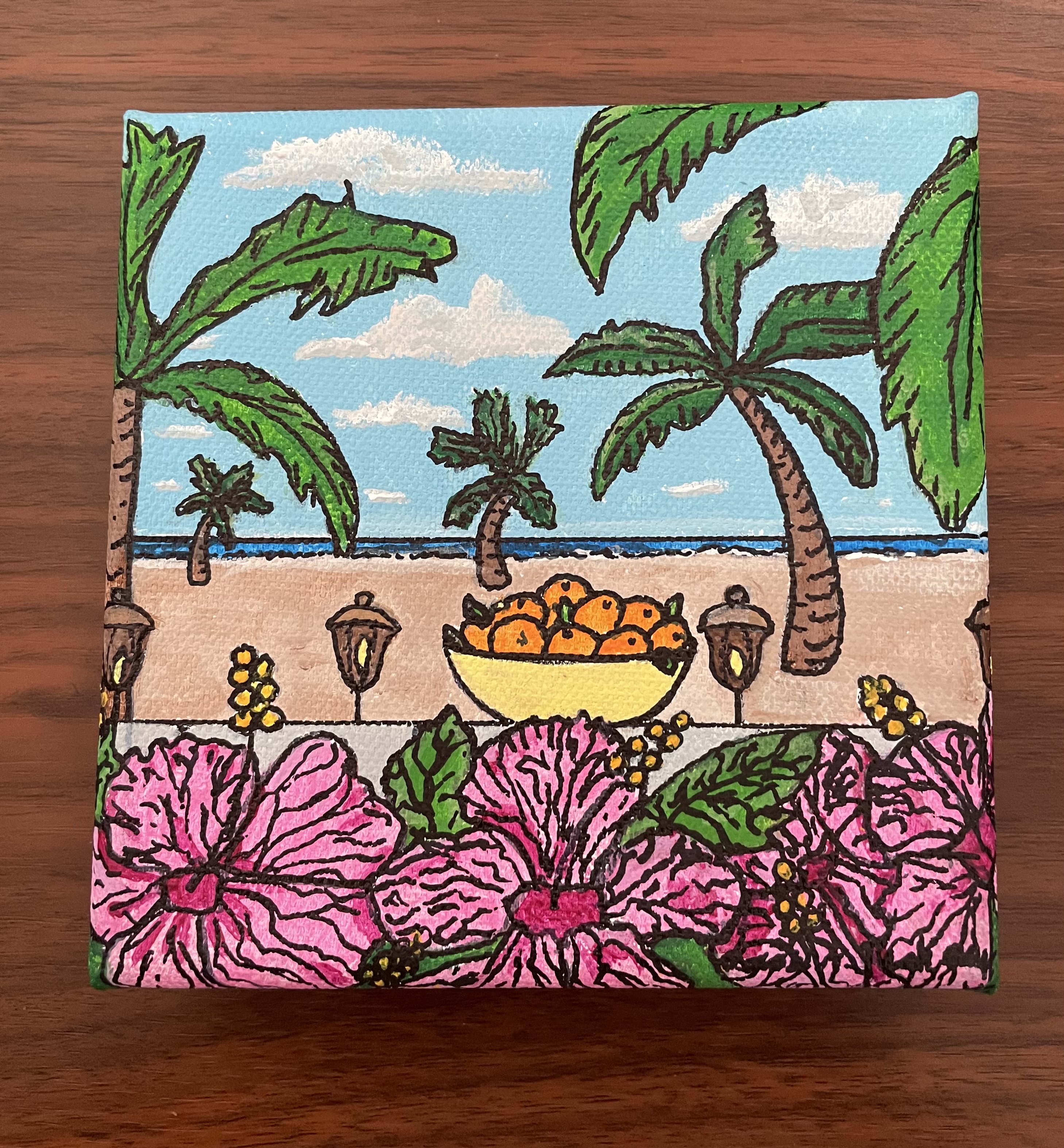 Oranges of the Beach is a perfect spot for enjoying a Florida treat. The Tiki lights will turn on at sundown. Hand painted.