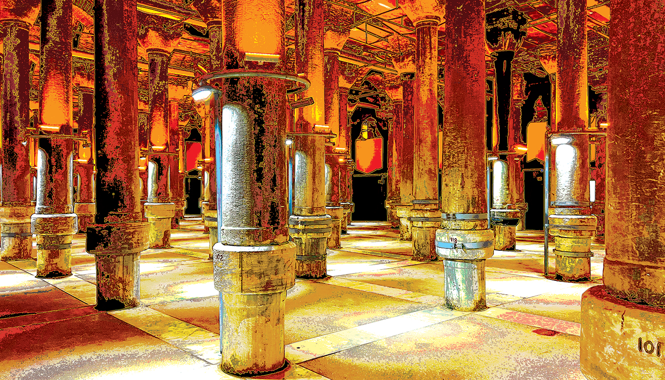 An ancient Bizantine Cistern in Istanbul, re-imagined through photo manipulation techniques. This composition reflects the repetitive columns and sense that the room goes on forever.