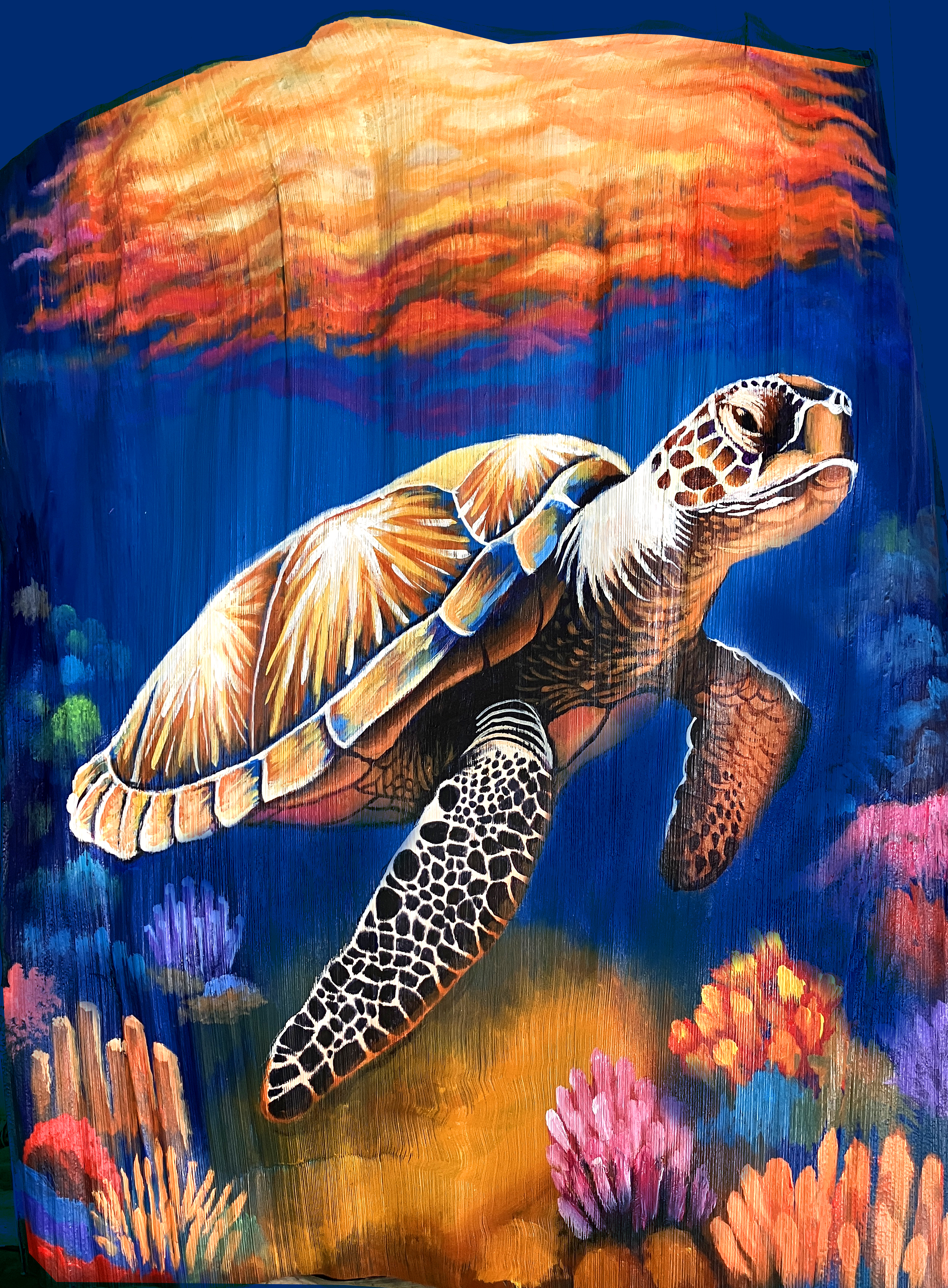 Painting of a turtle in the reef, painted on a Palm Frond