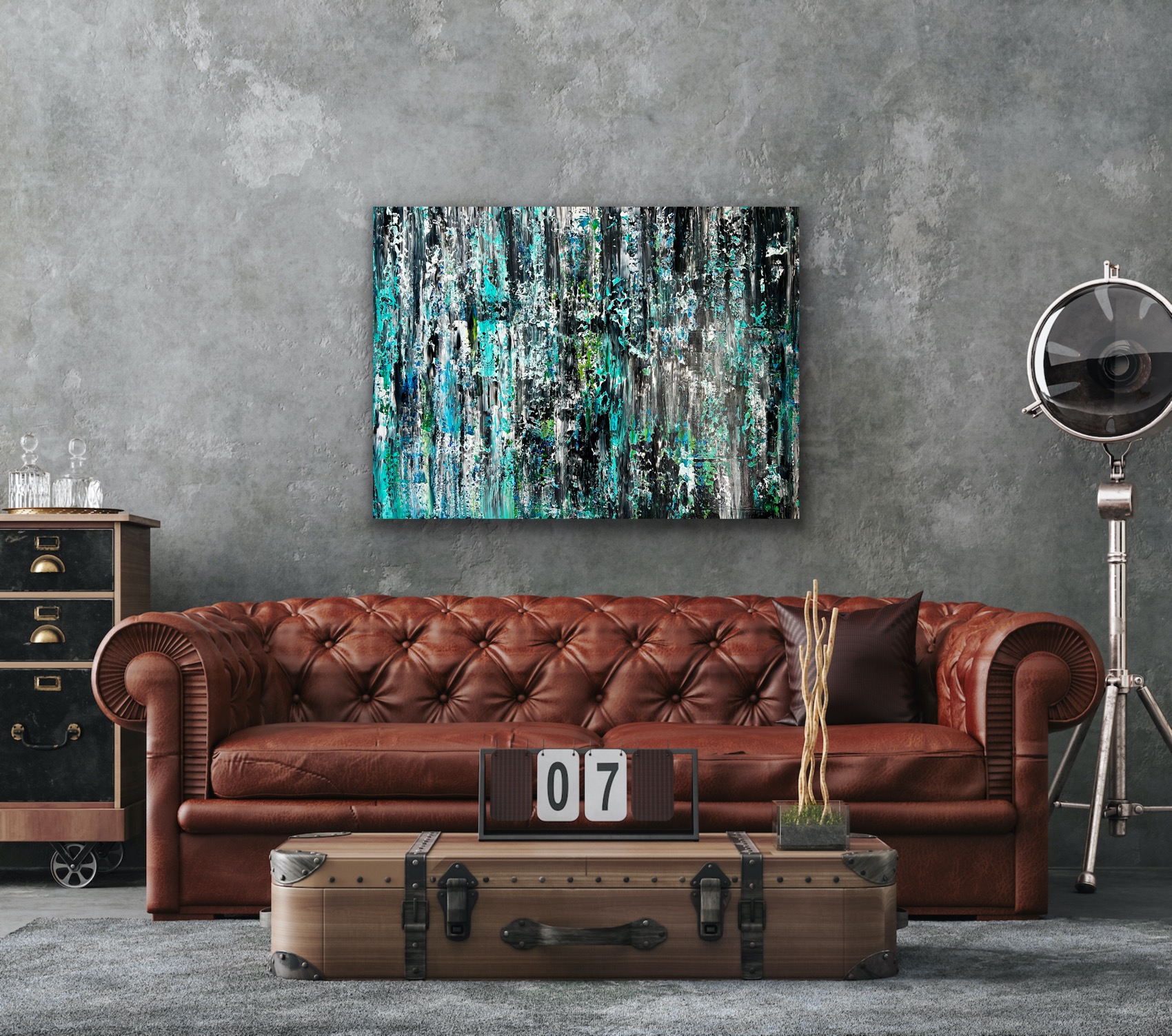 Acrylic on canvas, scraping technique Explores contrast — between opacity and reflection, stillness and motion. Using a layered scraping technique, each surface reveals what lies hidden beneath, evoking the feeling of peering through water into an unknown depth. The palette of turquoise, silver, and black mirrors the balance between strength and surrender — a quiet dialogue between what’s seen and what’s remembered.