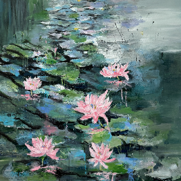 Zen Garden-Quiet Currents Beneath Pink Blooms